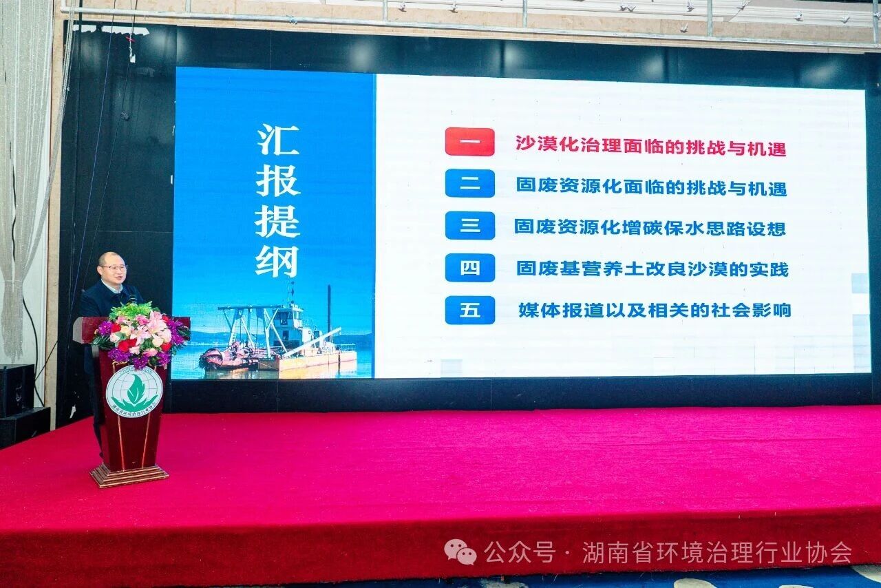 本次大会议程紧凑务实、亮点纷呈,专题分享与互动交流环节备受关注。特邀长沙理工大学水利与海洋工程学院孙士权教授,围绕沙漠化治理、固废资源化等核心议题,结合固废基营养土改良沙漠的实践案例展开深度分享,深入浅出解读该领域的技术趋势与发展方向,为会员单位破解生态治理技术瓶颈、拓宽固废资源化应用思路提供了专业指导与宝贵参考。湘治协首席专家、湖南大学环境设计研究所所长李小明也带来专题分享,针对行业发展痛点难点答疑解惑,切实帮助企业解决实际运营中的技术与发展难题。